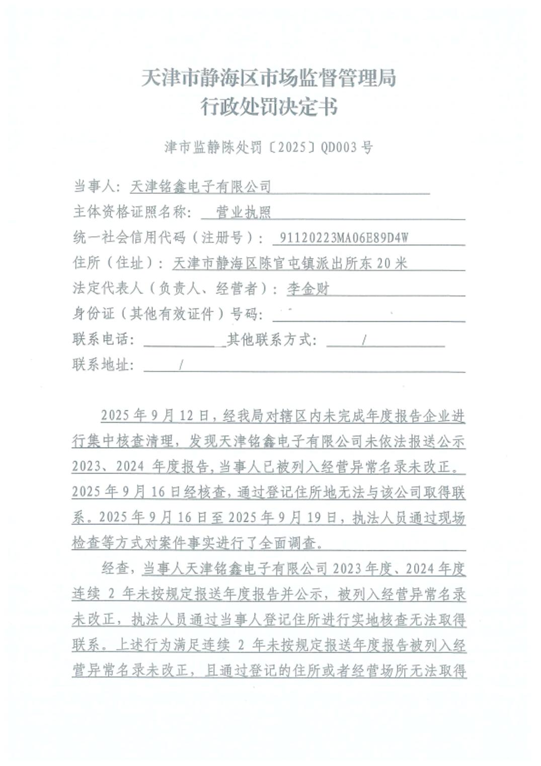 关于天津铭鑫电子有限公司的吊销行政处罚决定书公告