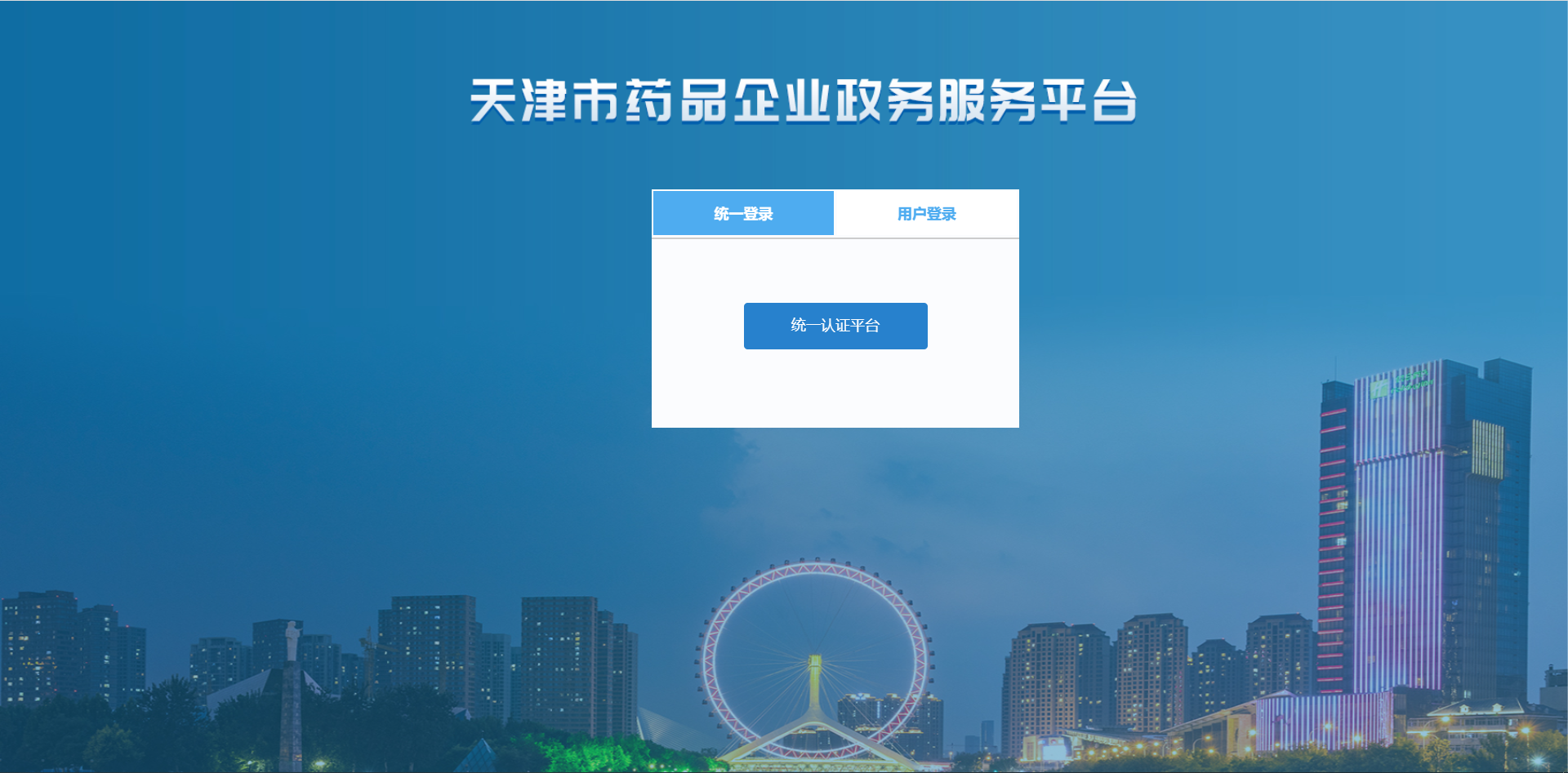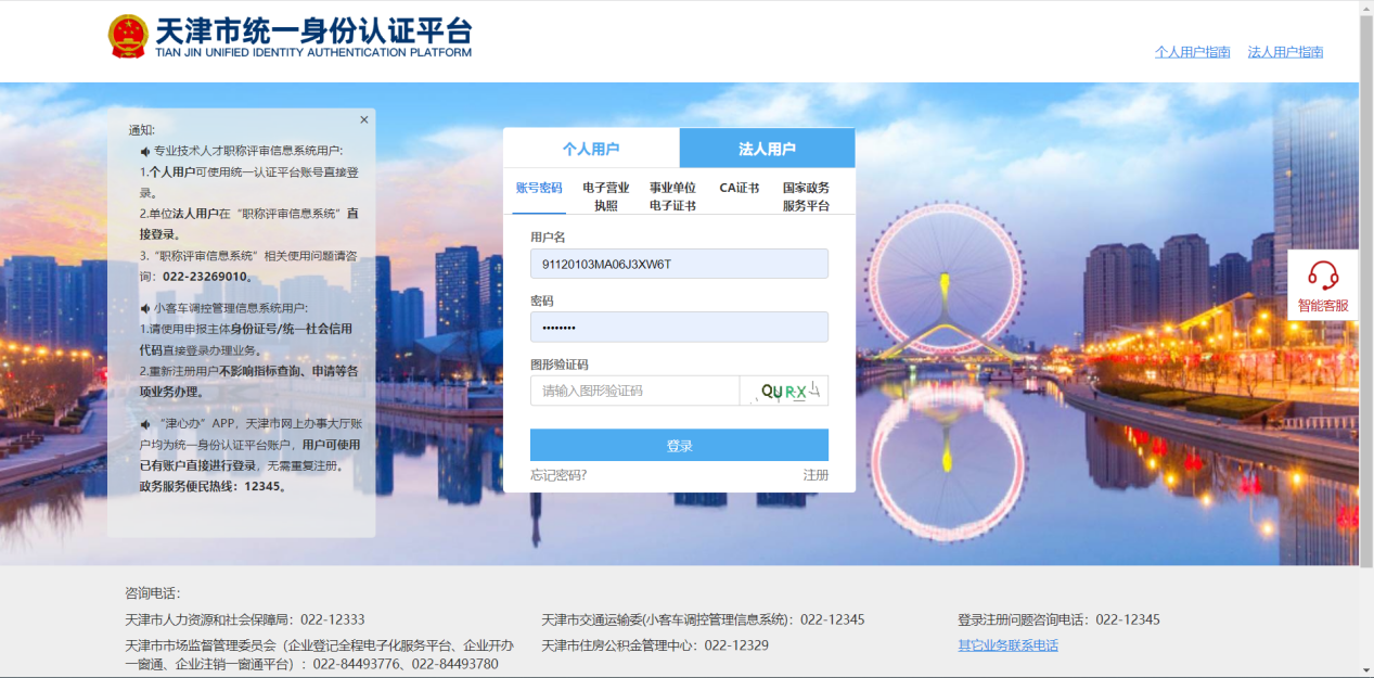 进入登录页面,选择统一登录,点击统一认证平台进入天津市网上办事大厅,使用法人用户登录。