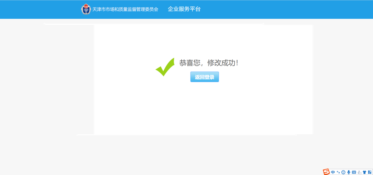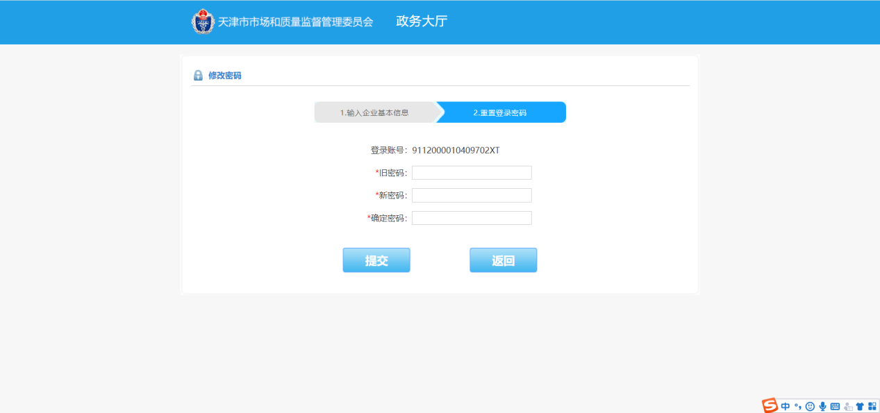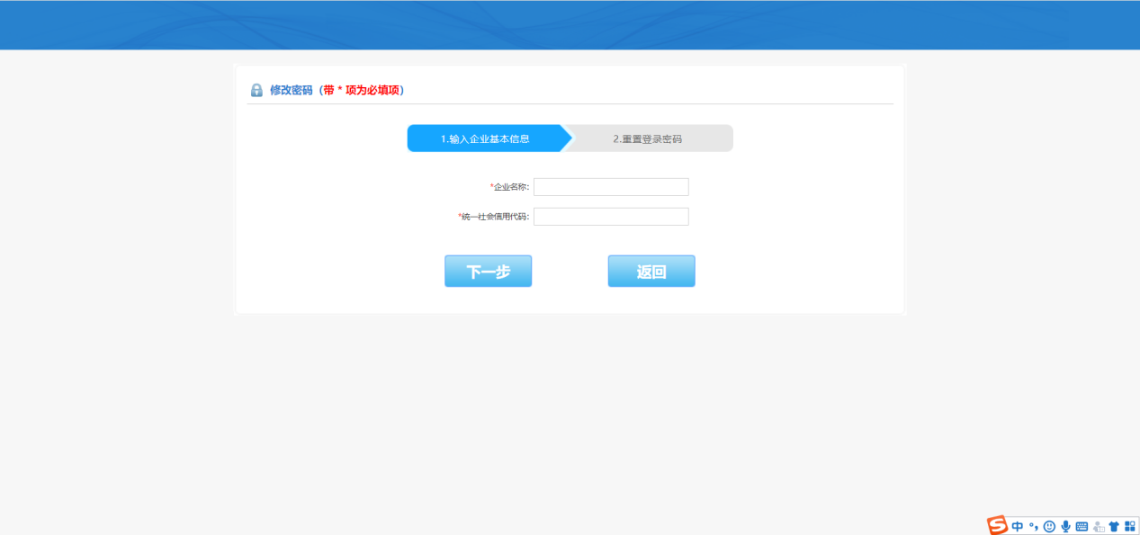 点击【修改密码】进入修改密码页面,该页面分为两步,第一步验证企业信息(如下图1),输入企业名称和统一社会信用代码,点击【返回】则返回登录页,点击【下一步】验证通过后进入修改密码页面(如下图2)。按要求输入旧密码,新密码,及确定密码。新密码要求:密码中必须包含大写字母、小写字母、数字、特殊字符(@、!、*)、长度为8-30位!。填写完成后点击【提交】如显示为图3则为密码修改成功。
