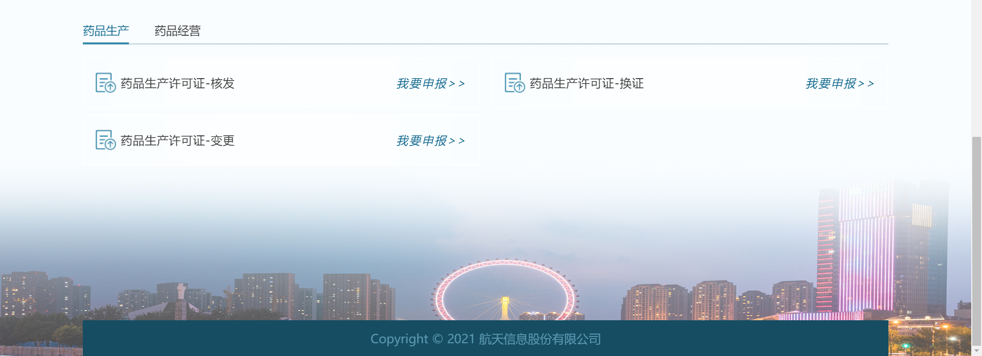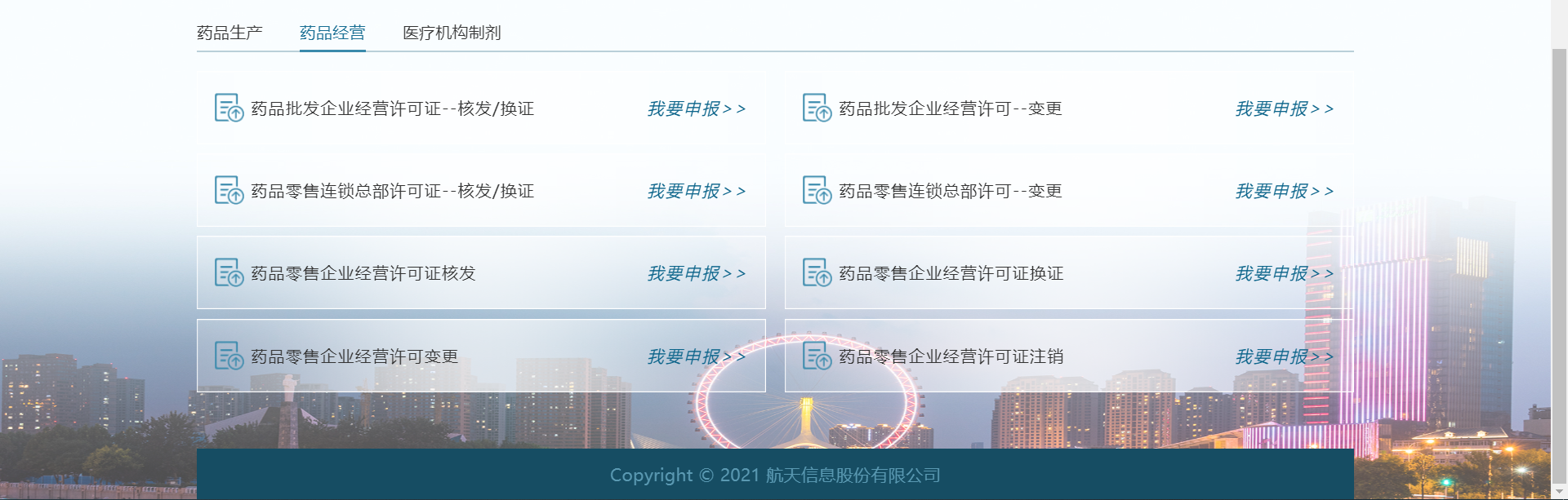 在该页面中可进行药品生产的许可申报:药品生产许可证-核发、药品生产许可证-换证、药品生产许可证-变更;药品经营的许可申报:药品批发企业经营许可证-核发/换证、药品批发企业经营许可-变更、药品零售连锁总部许可证-核发/换证、药品零售连锁总部许可-变更;药品零售企业经营许可证核发、药品零售企业经营许可证换证、药品零售企业经营许可变更、药品零售企业经营许可证注销
