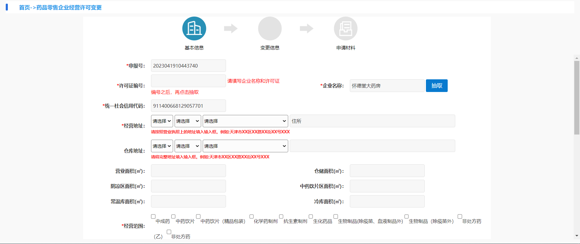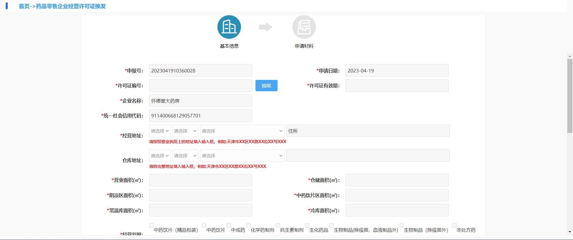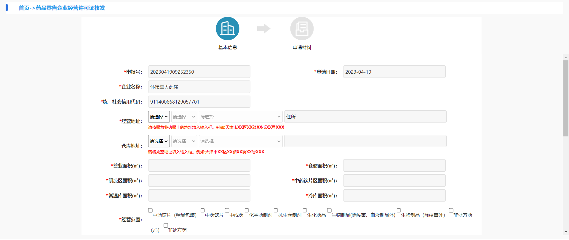 1.1企业基本信息,有申报号(默认带出)、申报日期(默认带出)、企业名称(默认带出)、统一社会信用代码(默认带出)、经营地址、仓库地址、营业面积(㎡)、阴凉区面积(㎡)、常温库面积(㎡)、仓储面积(㎡)、中药饮片区面积(㎡)、冷库面积(㎡)、经营范围、法定代表人身份证号、法定代表人联系电话联系人、联系电话、经营类型、零售类型、零售连锁许可证编号(连锁门店的许可证号)。(面积根据药店实际面积填写,没有的填0)