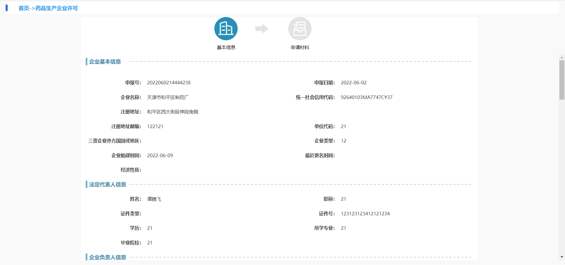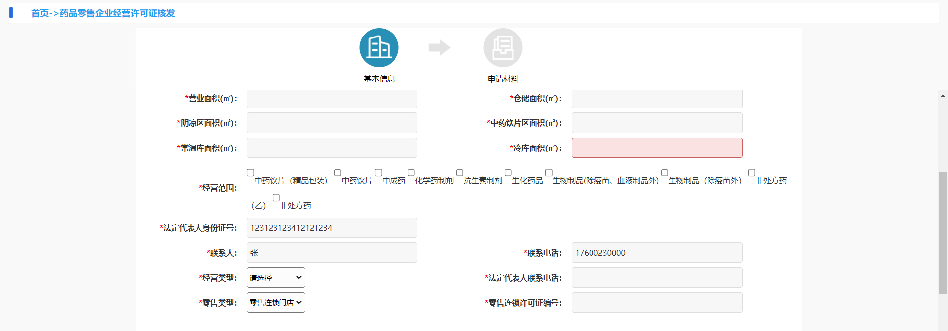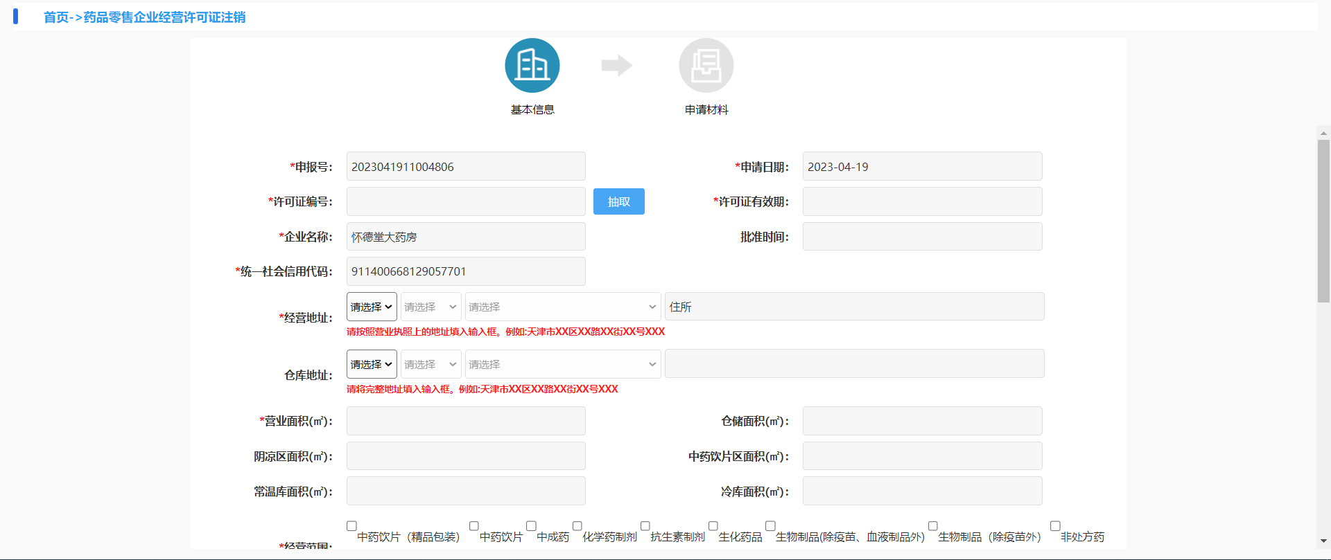 1.1企业基本信息,有申报号(默认带出)、申报日期(默认带出)、企业名称(默认带出)、统一社会信用代码(默认带出)、经营地址、仓库地址、营业面积(㎡)、阴凉区面积(㎡)、常温库面积(㎡)、仓储面积(㎡)、中药饮片区面积(㎡)、冷库面积(㎡)、经营范围、法定代表人身份证号、法定代表人联系电话联系人、联系电话、经营类型、零售类型、零售连锁许可证编号(连锁门店的许可证号)。(面积根据药店实际面积填写,没有的填0)