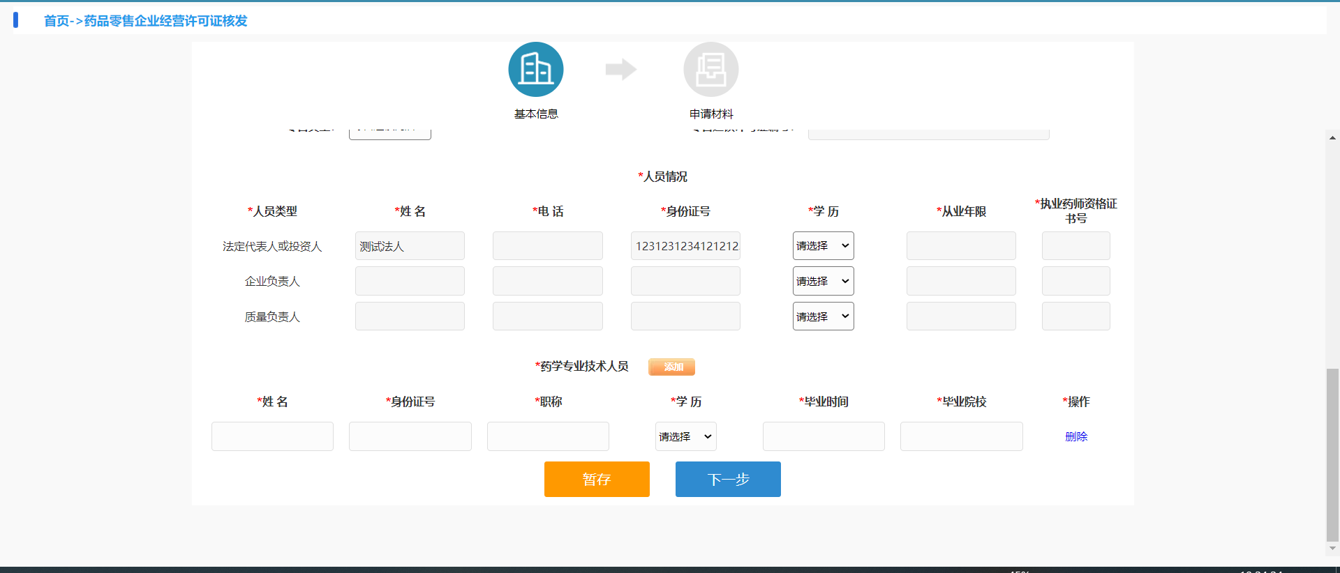 需要填写药学专业技术人姓名、身份证号、职称、学历、毕业时间、毕业院校。(有多人的可以点击【添加】增加多条药学专业技术人员信息)