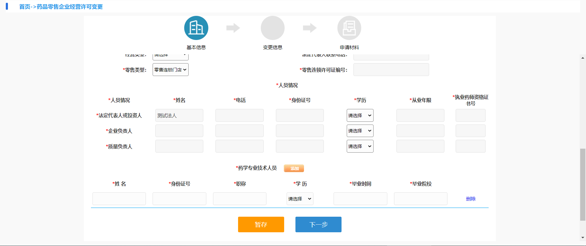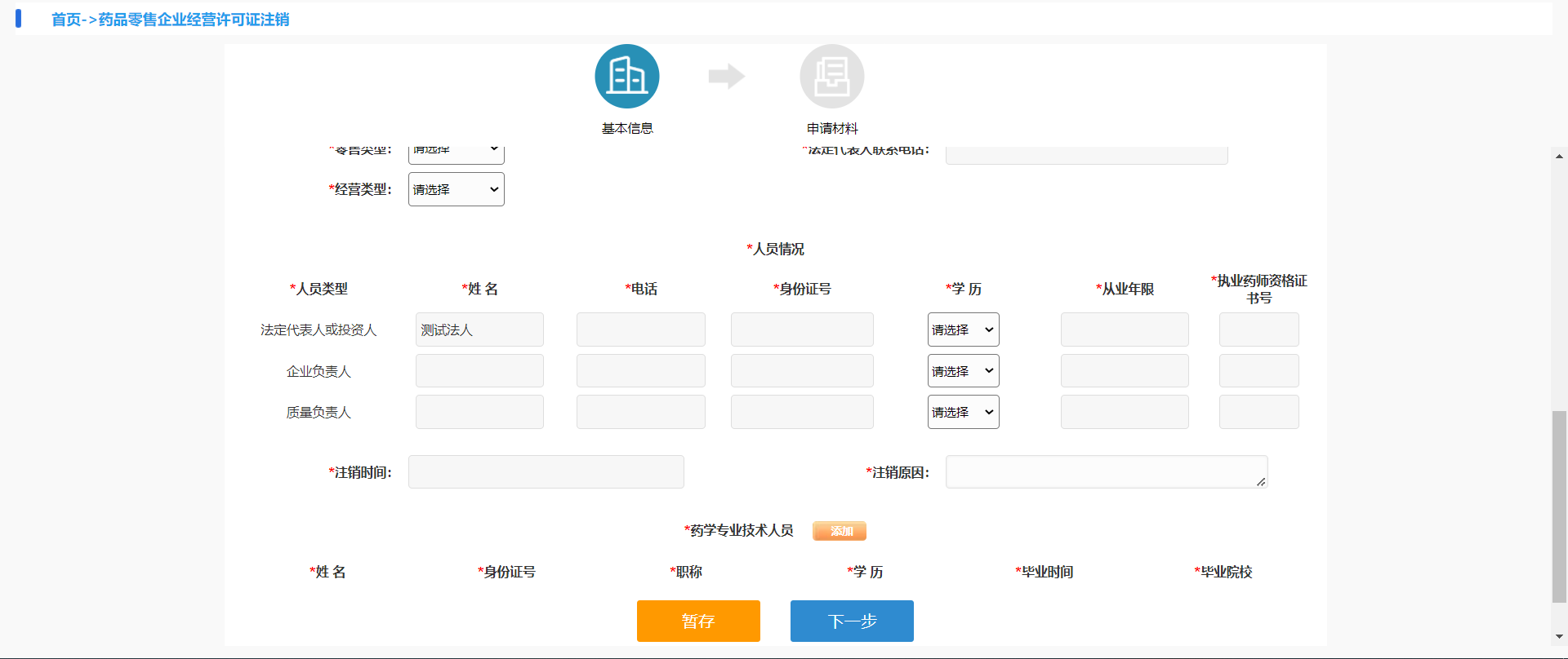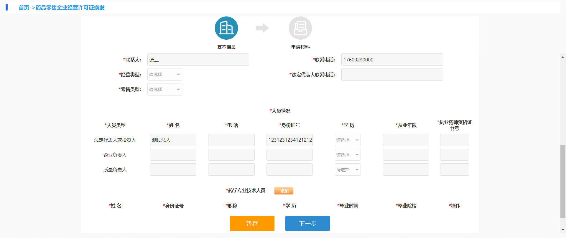 需要填写姓名、电话、身份证号、学历、从业年限、执业药师资格证书号。(非法人的企业,法人信息可以填***)