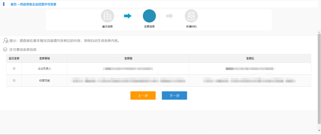 该页面中可以看到变更的事项,该事项变更前内容和变更后内容。如果修改不正确,点击上面的【基本信息】回到基本信息页面重新修改。如果内容无误,点击【暂存】保存页面填写的数据,‘提示:暂存成功’则数据保存成功。点击【下一步】则进入申请材料页面并自动保存页面数据。