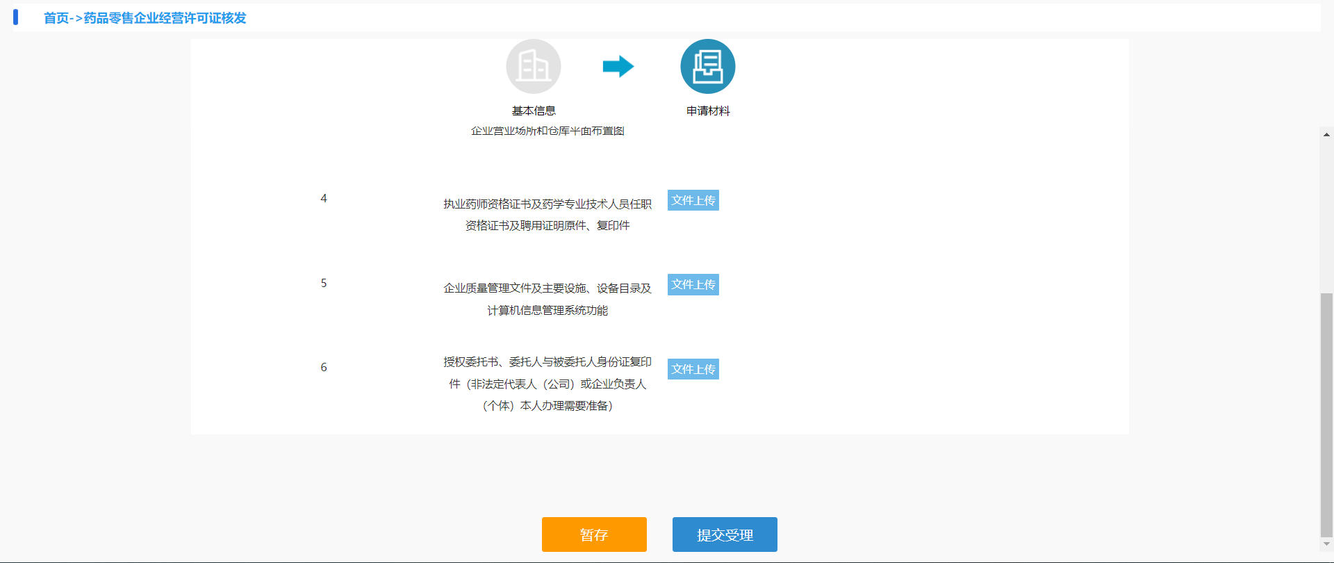 核对并填写页面信息后,点击【暂存】保存页面填写的数据,‘提示:暂存成功’则数据保存成功。点击【下一步】则进入申请材料页面并自动保存页面数据。