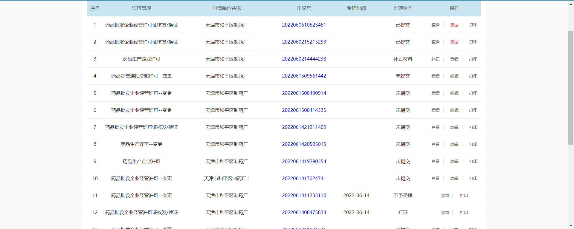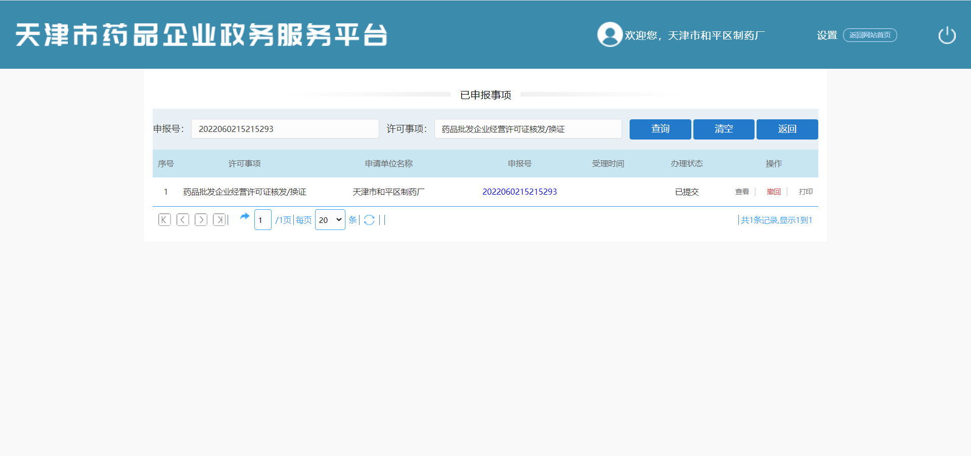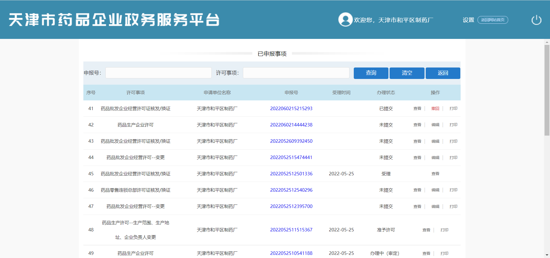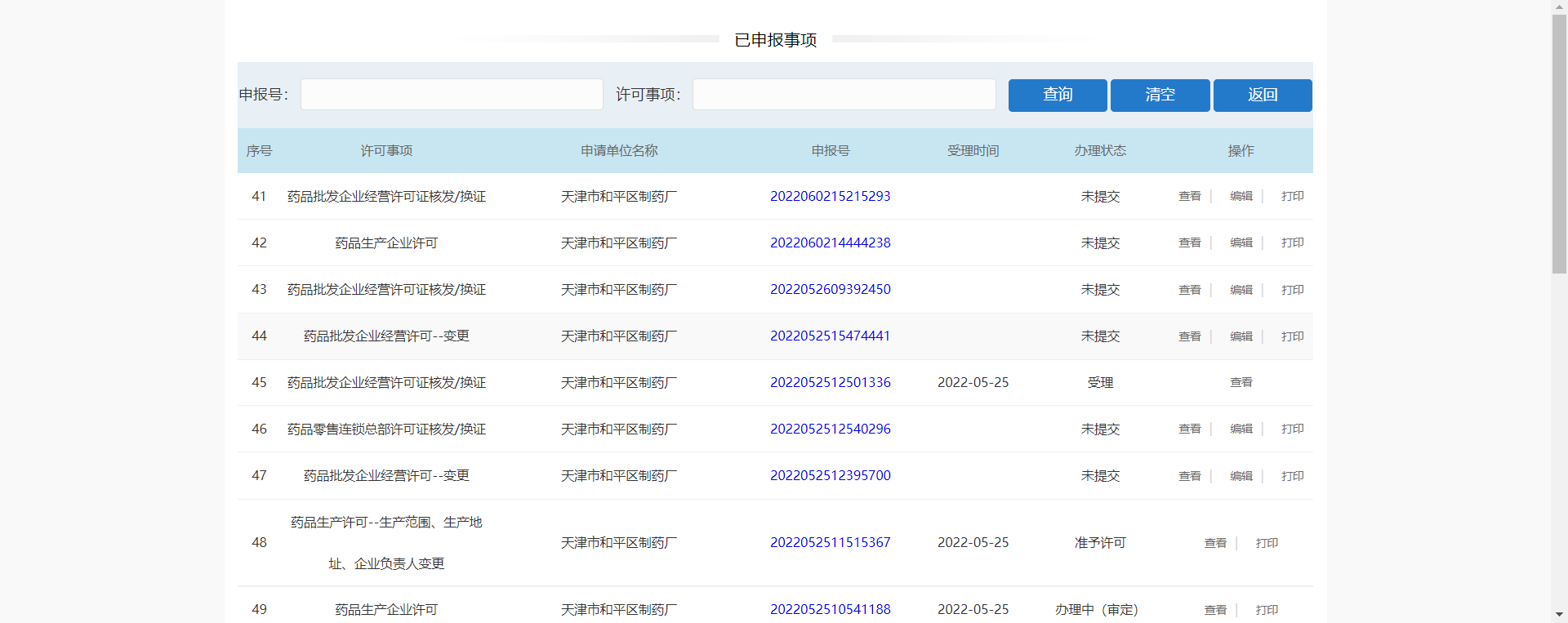在当前页面查看申报事项列表(序号、许可事项、申请单位名称、申报号、受理时间、办理状态、操作)。可进行【查询】、【清空】、【返回】、【查看】、【打印】操作。
