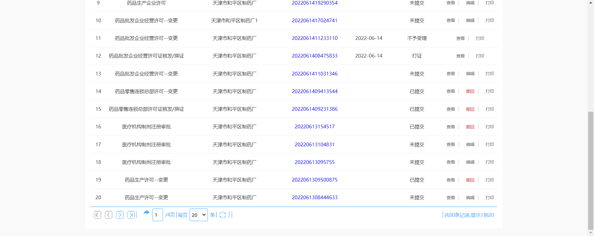 办理状态已提交:可进行【查看】【撤回】【打印】操作