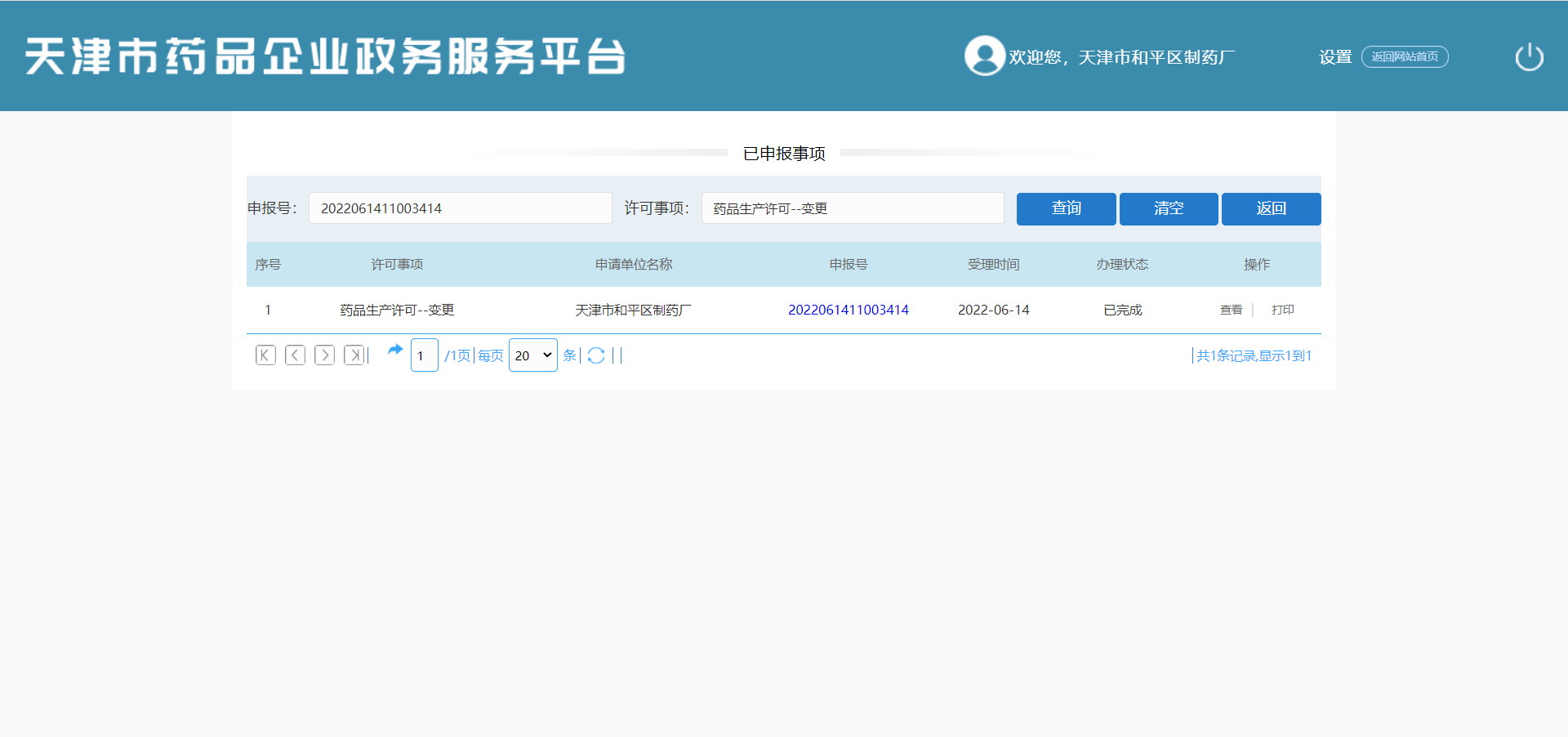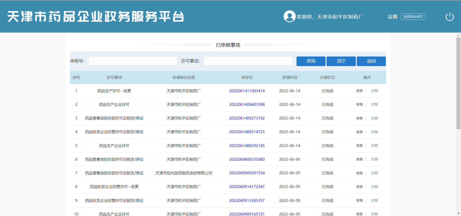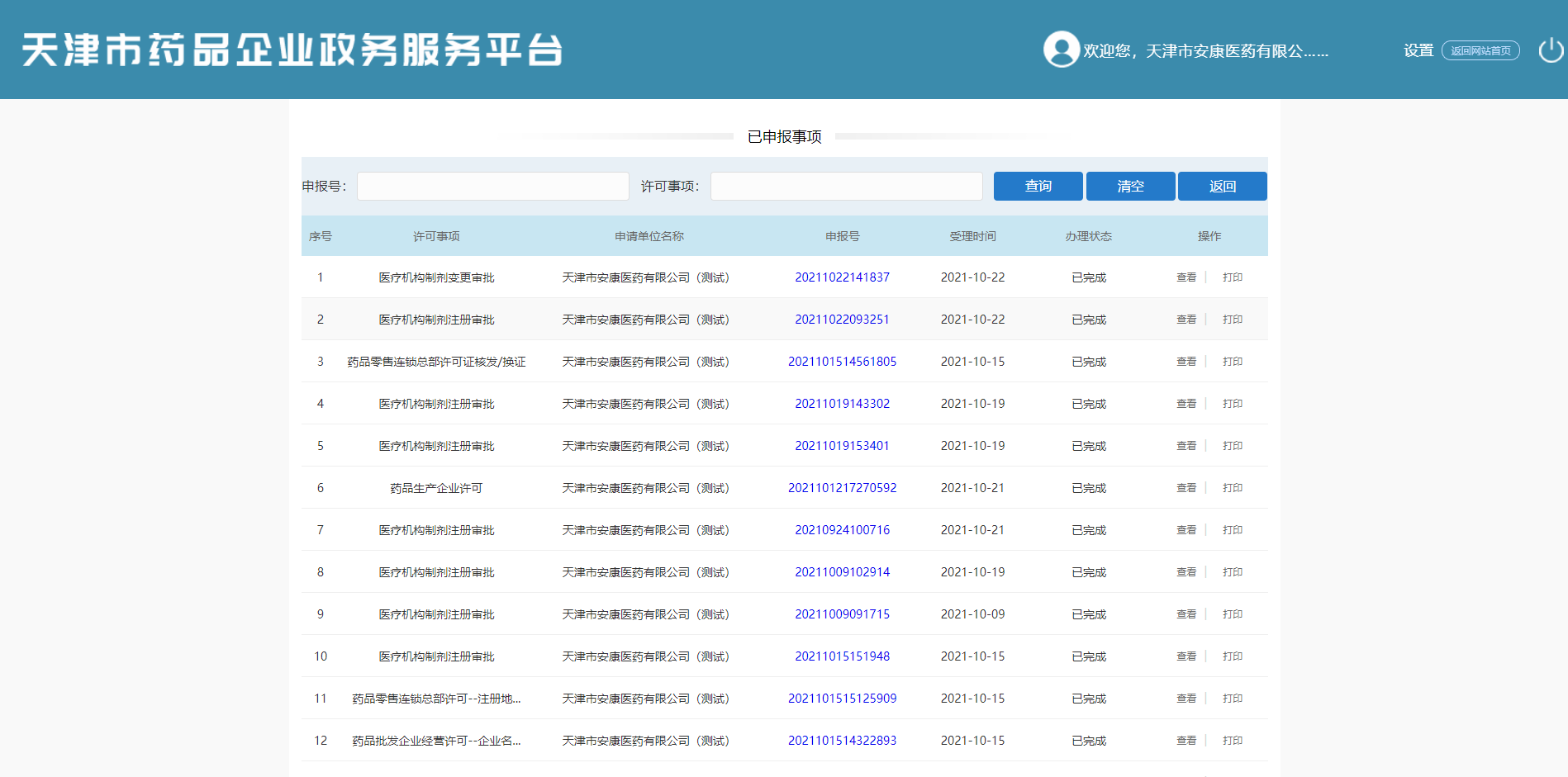 在当前页面查看已完成申报事项列表(序号、许可事项、申请单位名称、申报号、受理时间、办理状态、操作)。可进行【查询】、【清空】、【返回】、【查看】、【打印】操作。