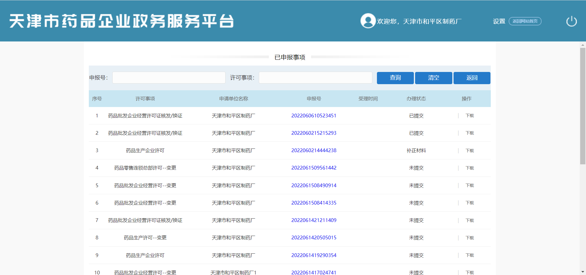 在当前页面查看申报事项列表(序号、许可事项、申请单位名称、申报号、受理时间、办理状态、操作)。可进行【查询】、【清空】、【返回】、【下载】操作。
