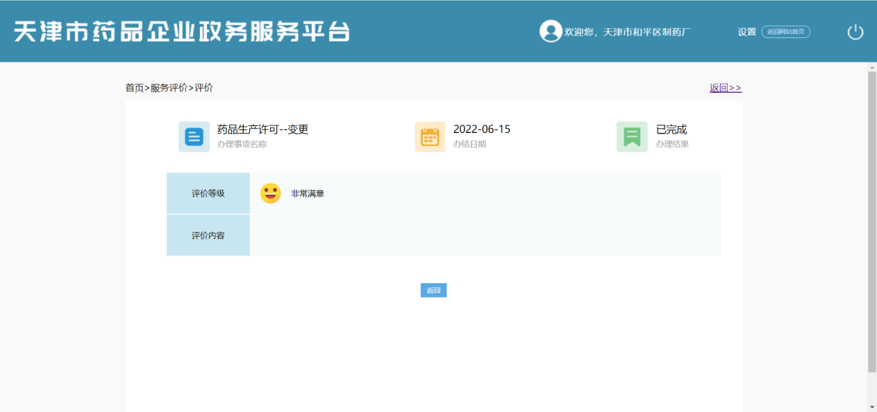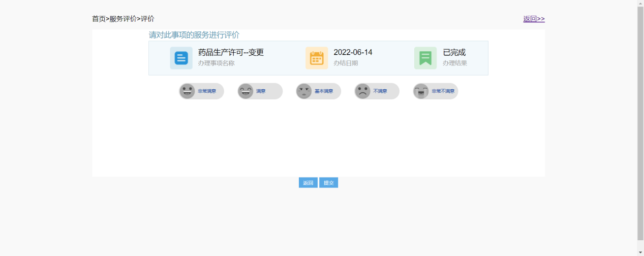 选择非常满意或满意或基本满意点击【提交】如提示:操作成功,则评价完成,返回服务评价列表页面,如下图: