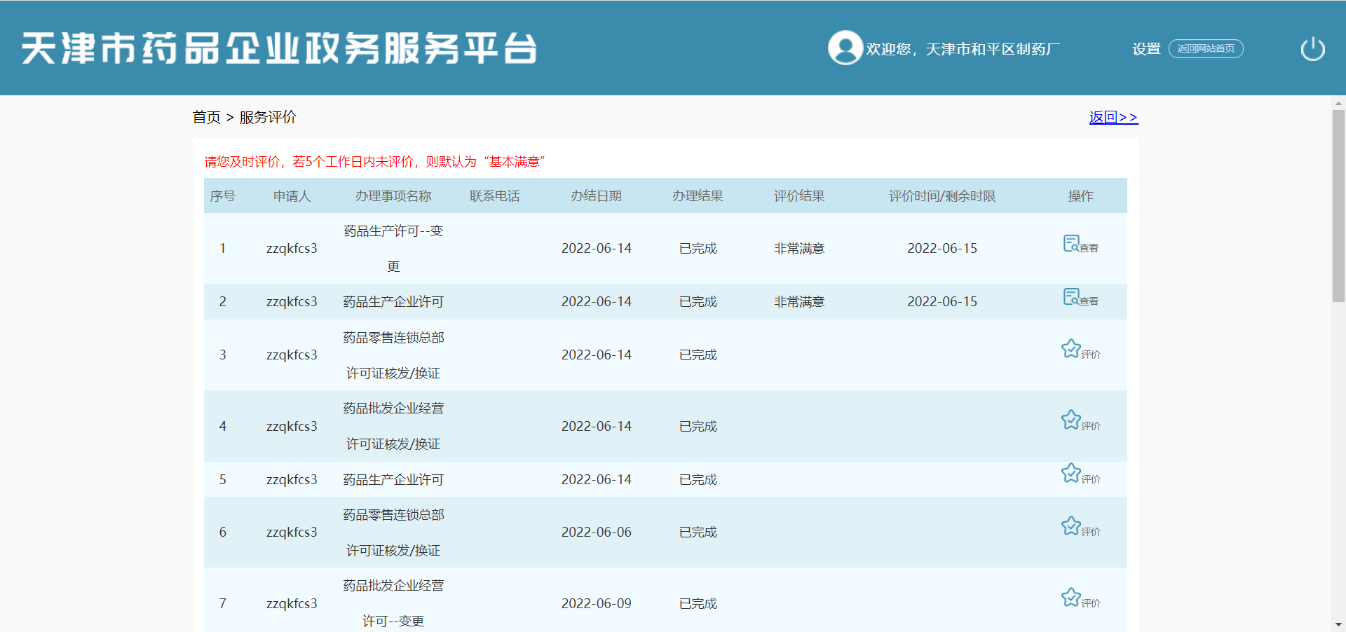 在当前页面查看服务评价项列表(序号、申请人、办理事项每次、联系电话、办结日期、评价结果、评价时间/剩余时限、操作)。可进行【返回】、【评价】操作。