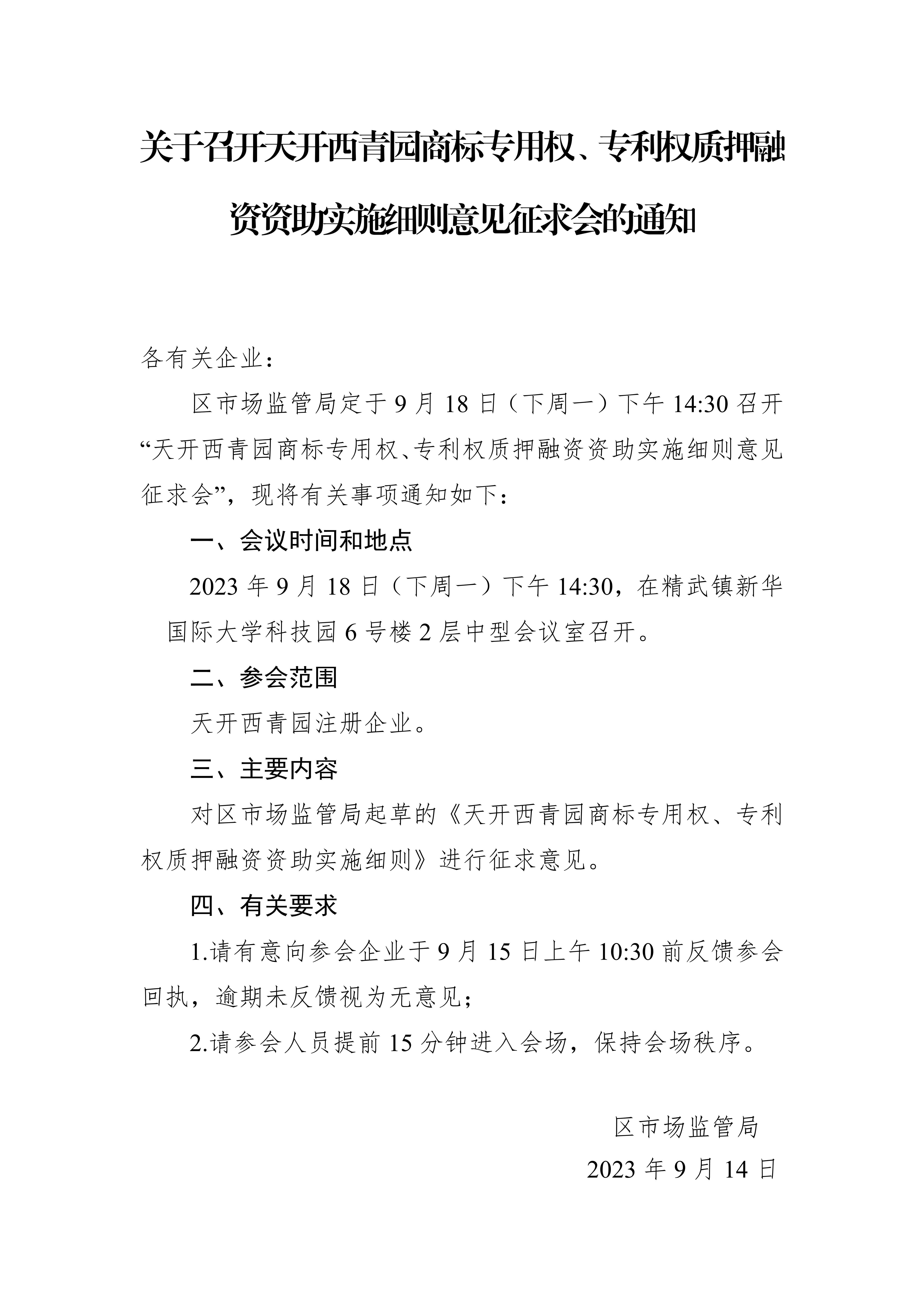 关于召开天开西青园商标专用权、专利权质押融资资助实施细则意见征求会的通知